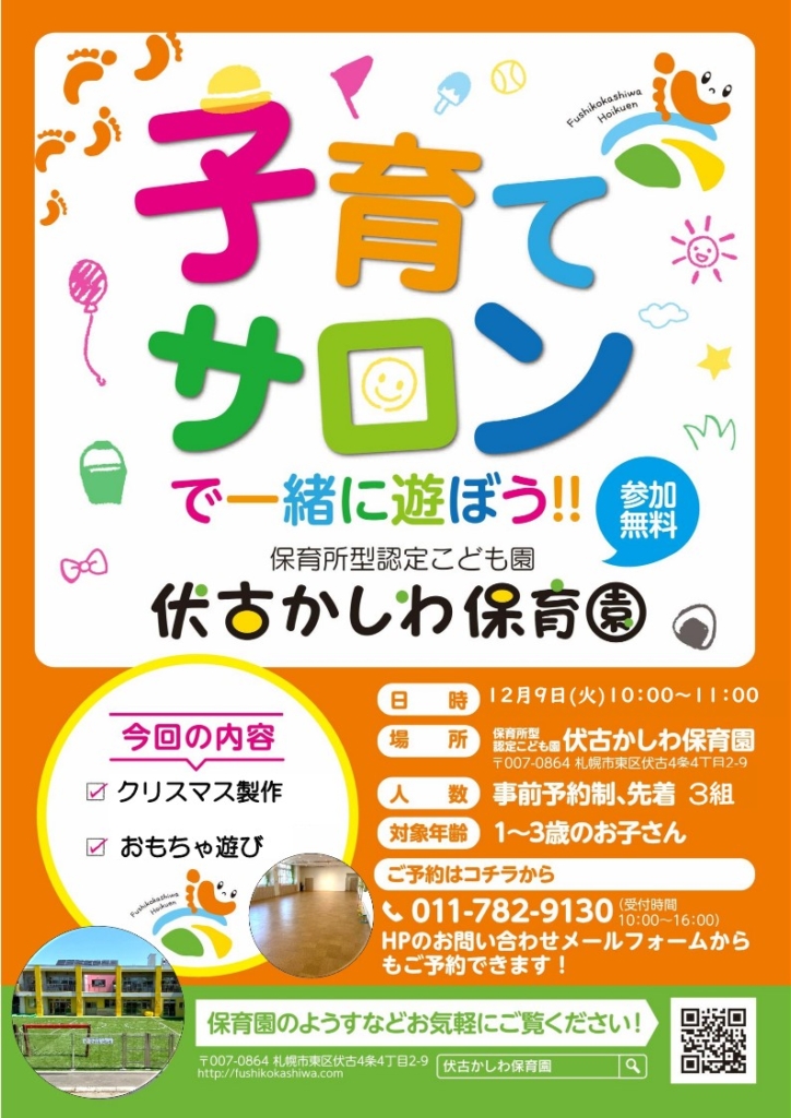 12月9日(火) 子育てサロンを開催します!1~3歳児のご家庭先着3組となります。保育園の見学を兼ねてでも構いません。是非遊びにいらしてください♪